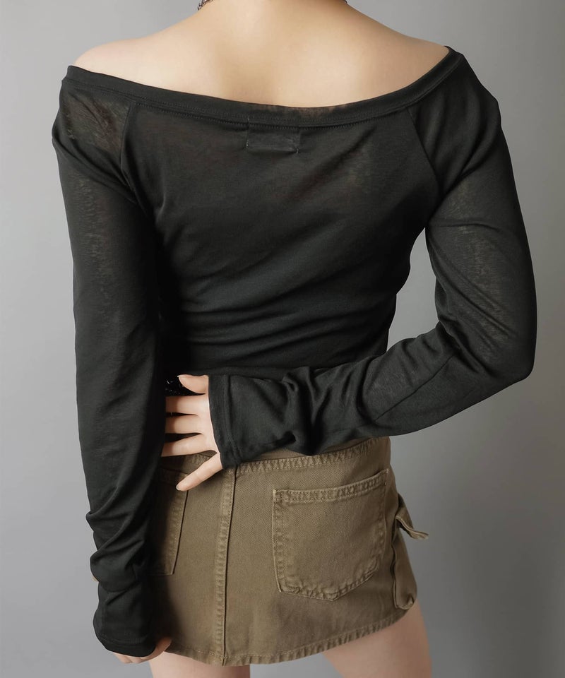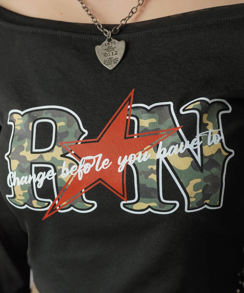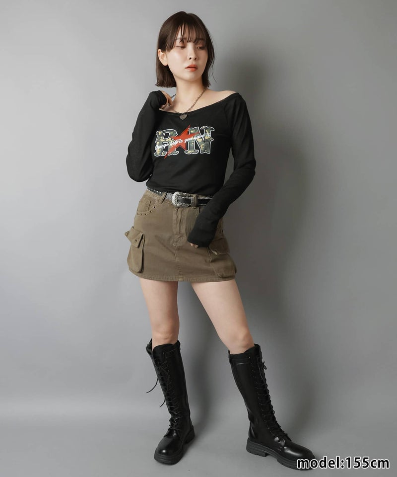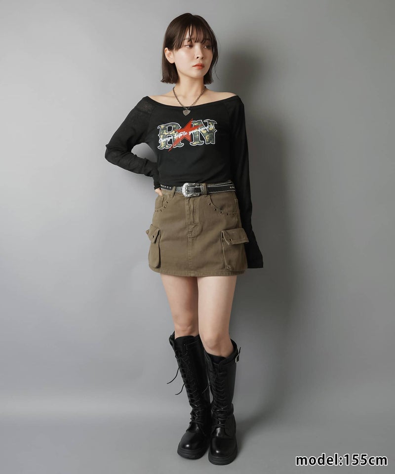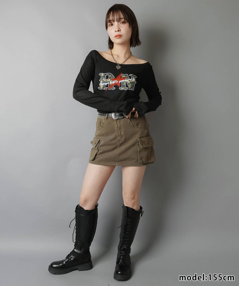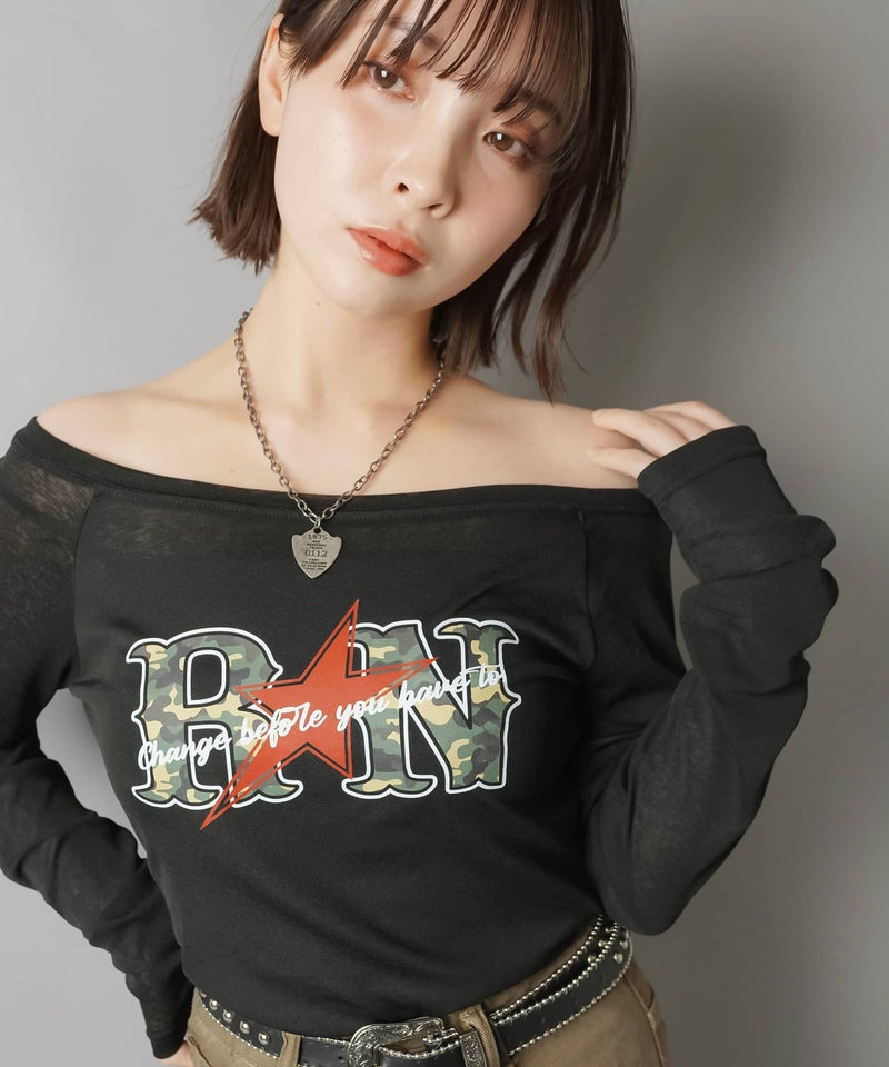 オフショル長袖カットソー/ラグラン/カモ柄ロゴ