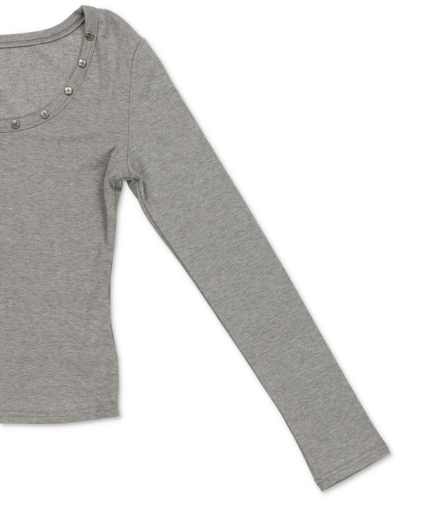胸元にあしらったメタルスタッズがキラッと光って、シンプルながらもおしゃれ見えするデザイン。