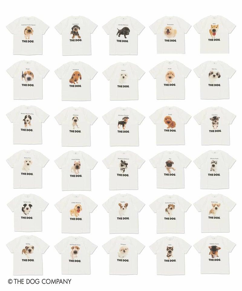 THE DOGの特徴の魚眼レンズで撮影されたキュートなワンコを大きくプリントしたTシャツで、全30種と幅広い犬種からお選びいただけるのがポイント。実際に飼っているワンコの種類を着用してもよし!ぜひ推し”ワンコ”を見つけてTシャツでアピールしましょう。