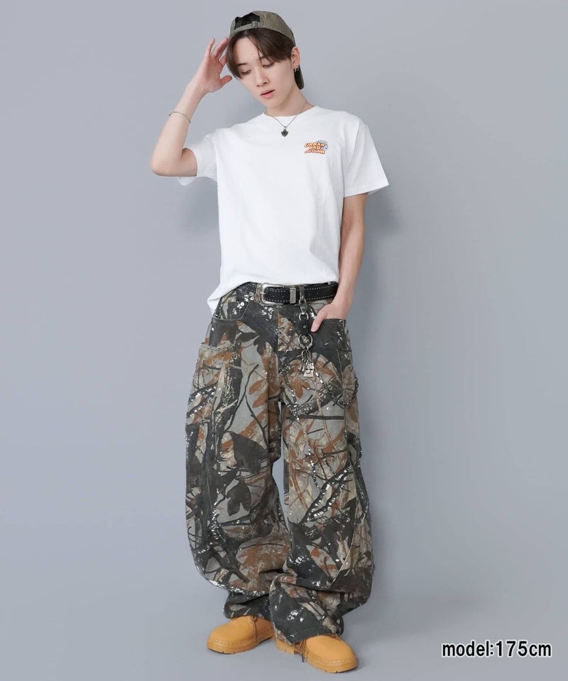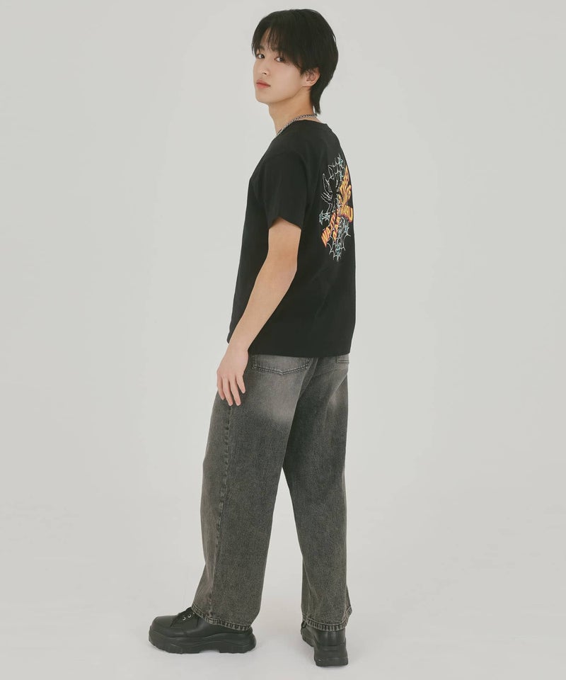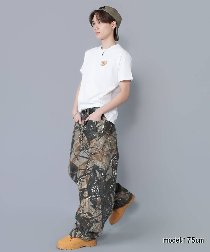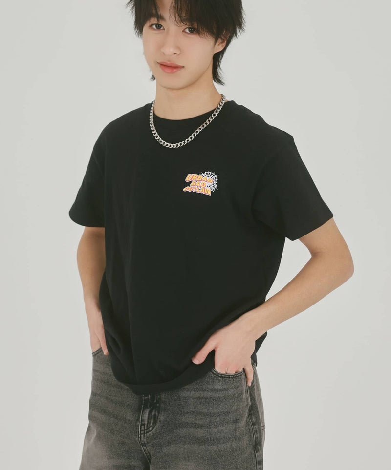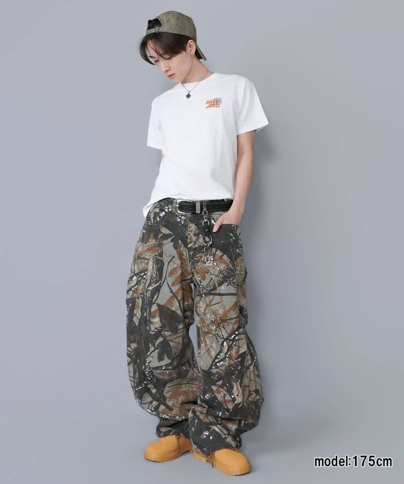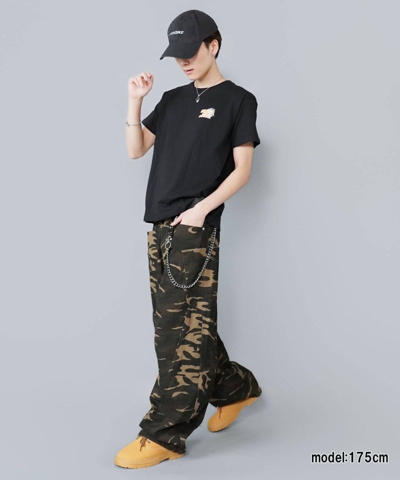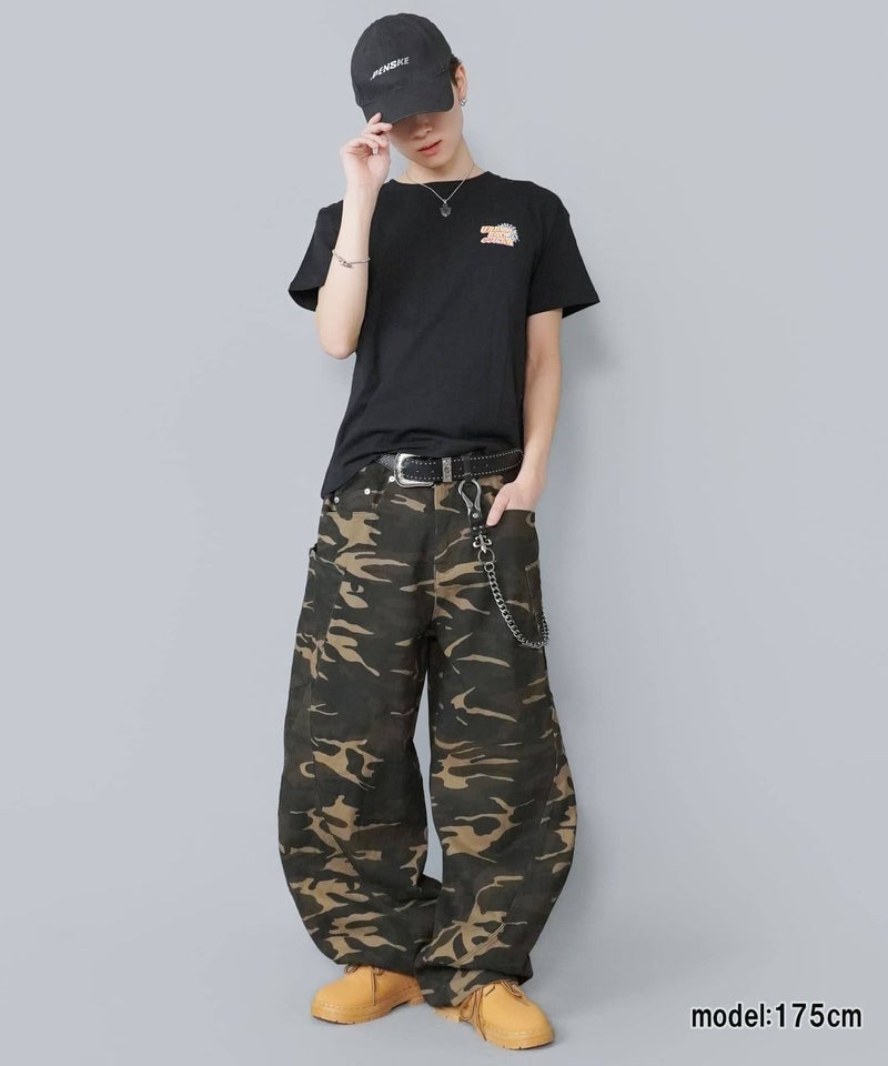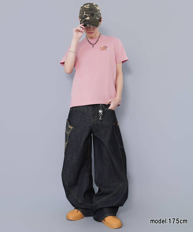 組み合わせたバックプリントが目を引く半袖Tシャツ。