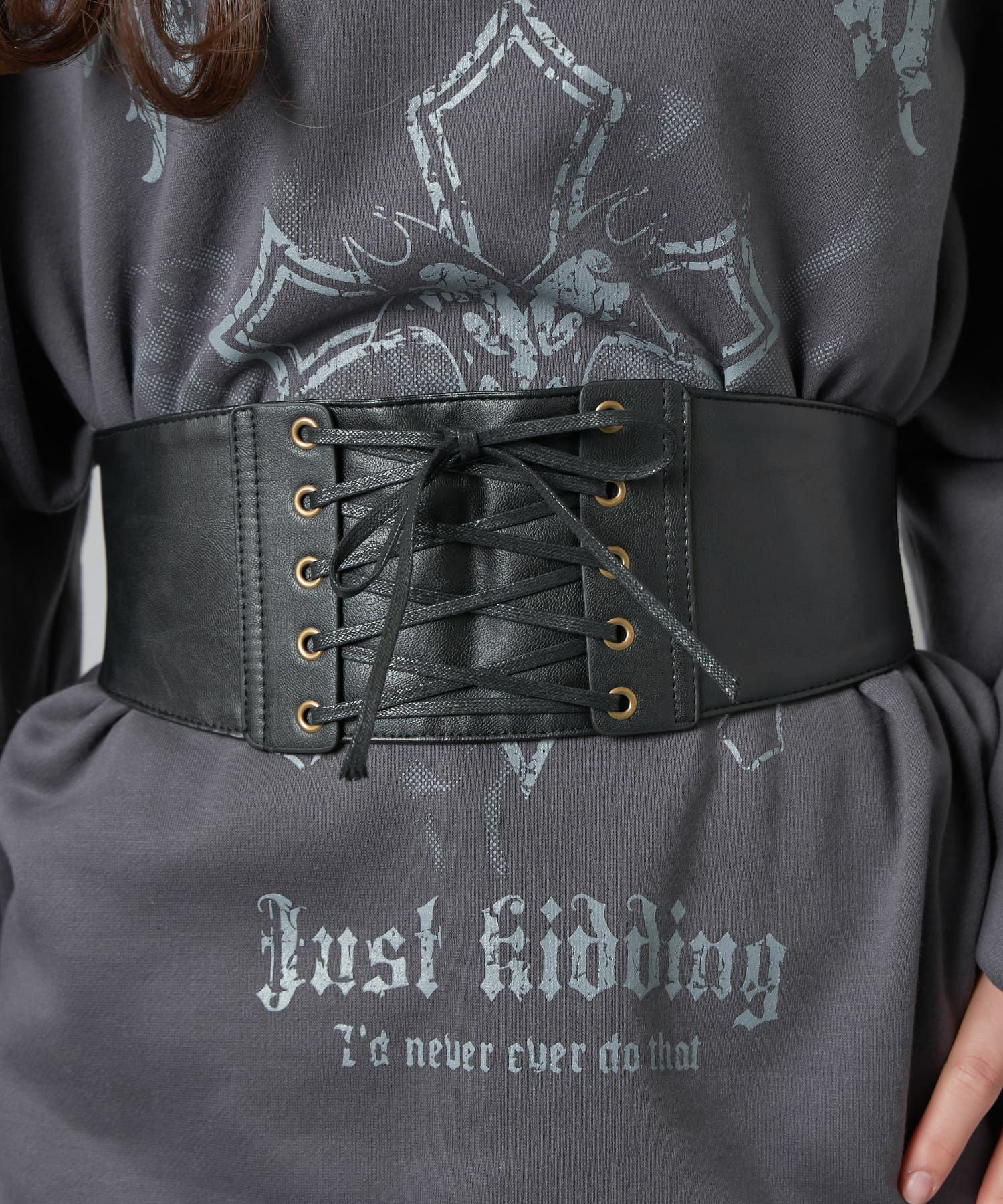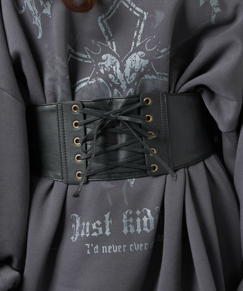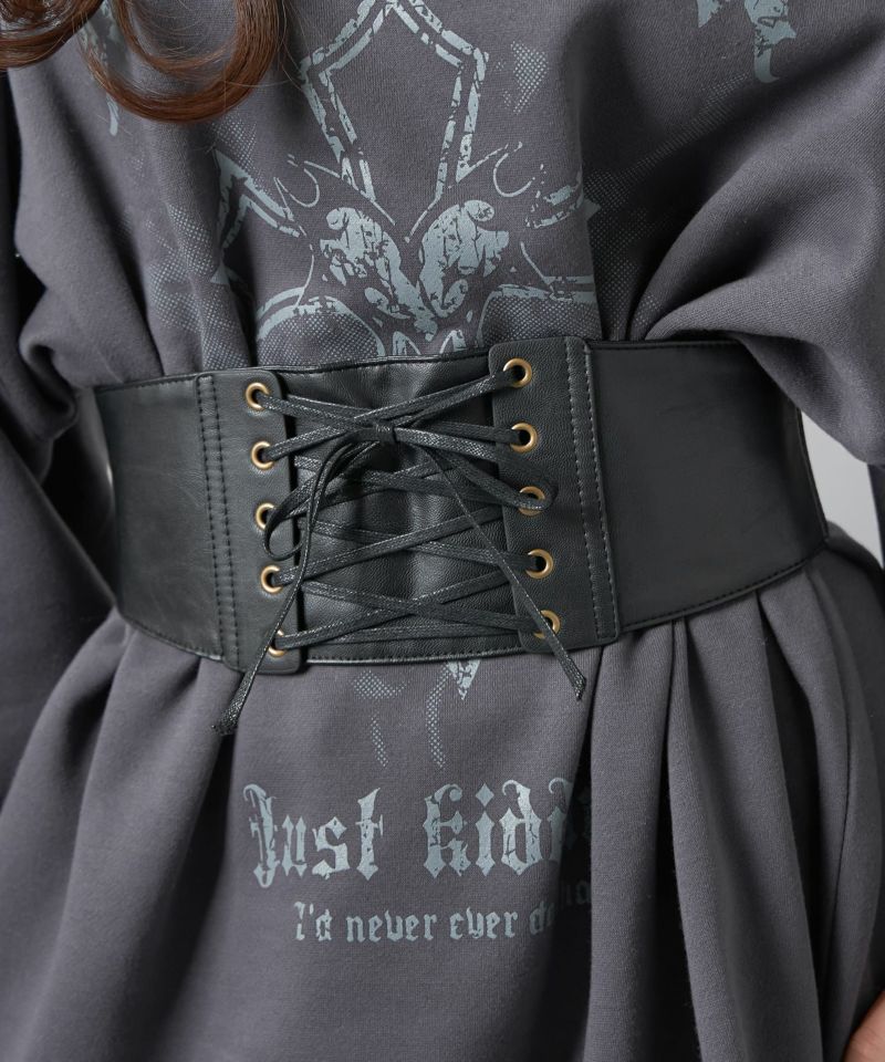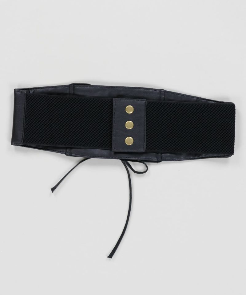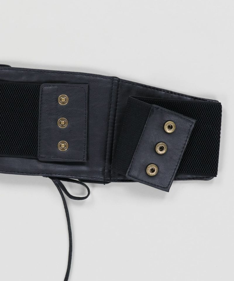 シンプルな腰回りを上品に演出するフェイクレザーコルセット。