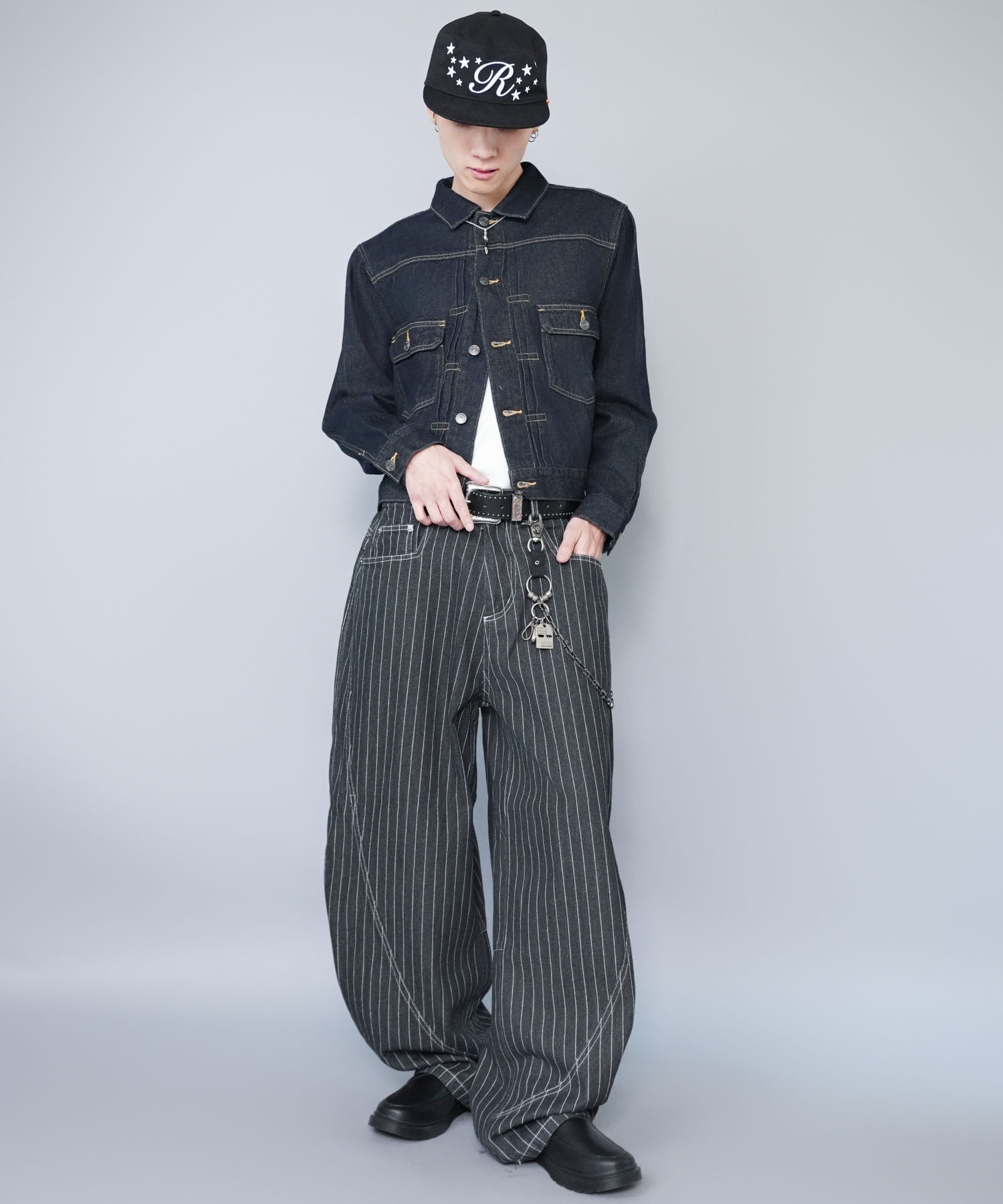 メンズ春ストリート|ピンストライプデニムバルーンパンツ×短丈デニムジャケットで作るストリートコーデ
