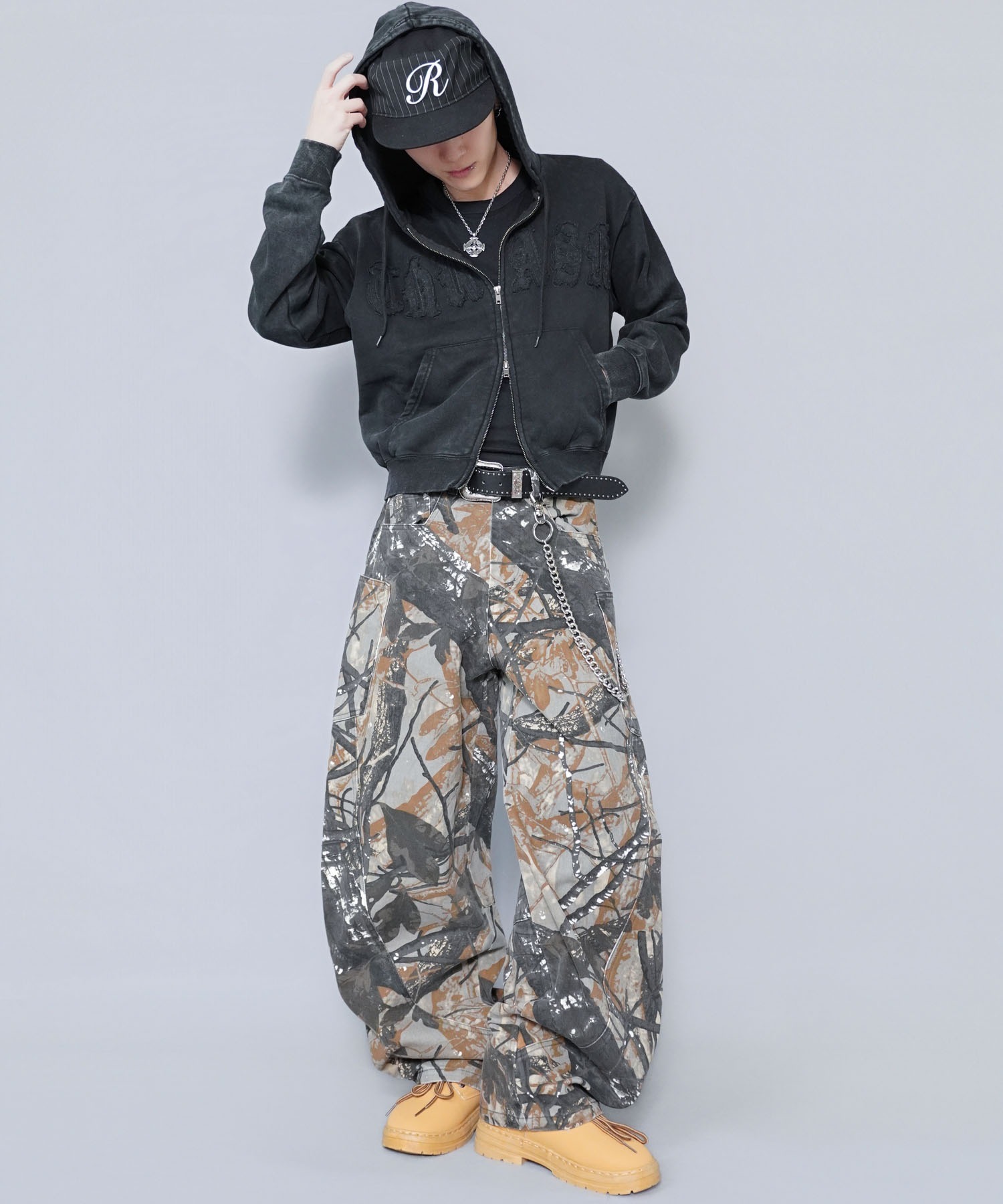 メンズ春ストリート|リアルツリー柄カーブパンツ×短丈ジップパーカーで作るストリートコーデ