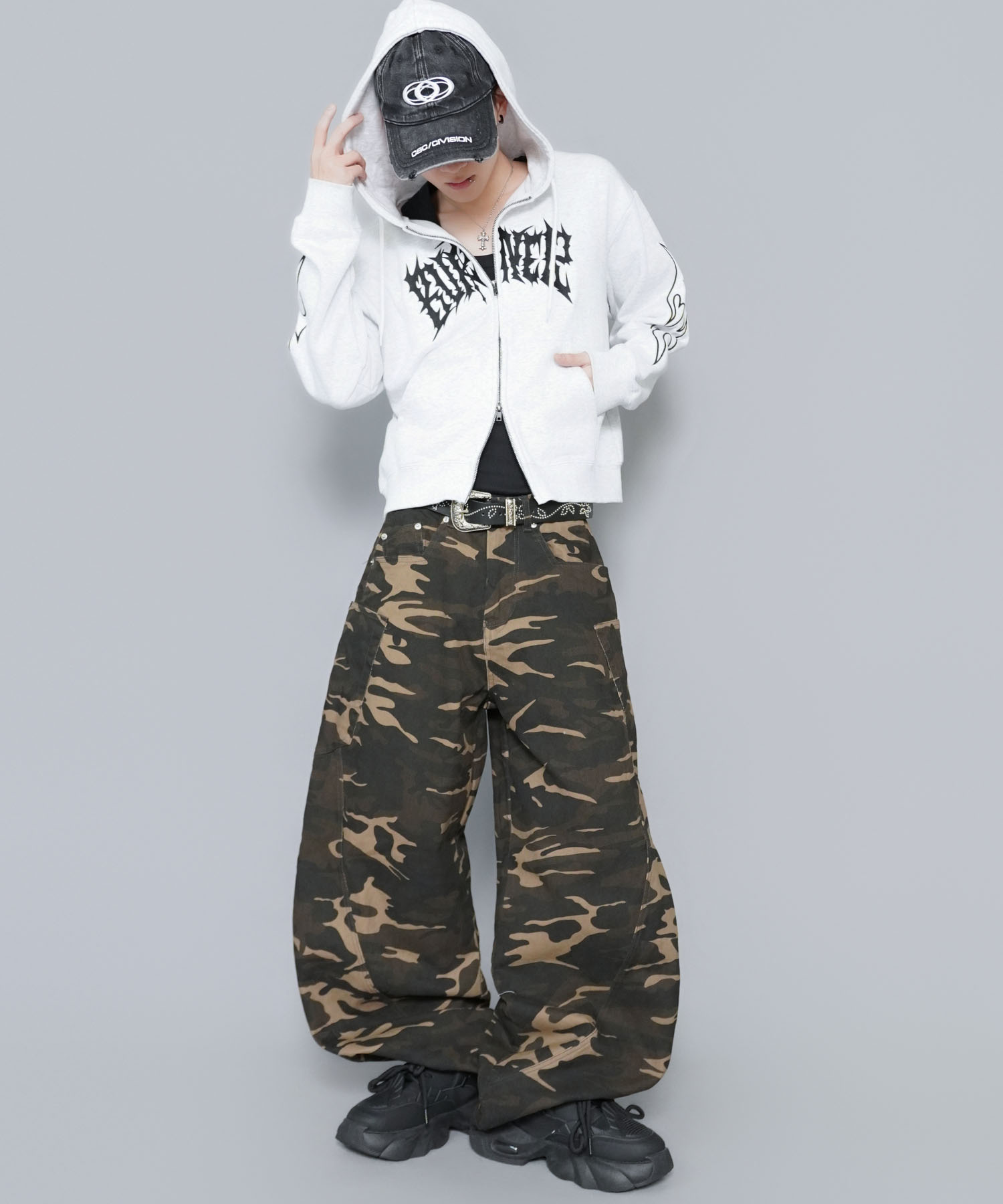 メンズ春グランジ|短丈ダブルジップパーカー×カモ柄バレルレッグパンツで作るグランジコーデ