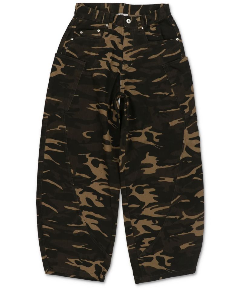 カモフラージュ柄のバレルレッグカーブパンツを合わせた