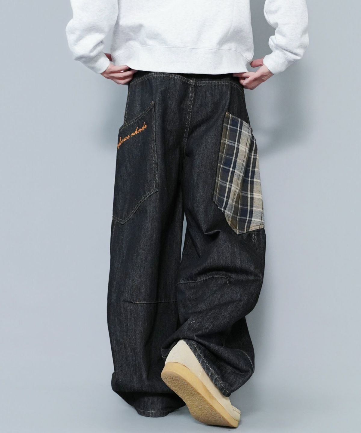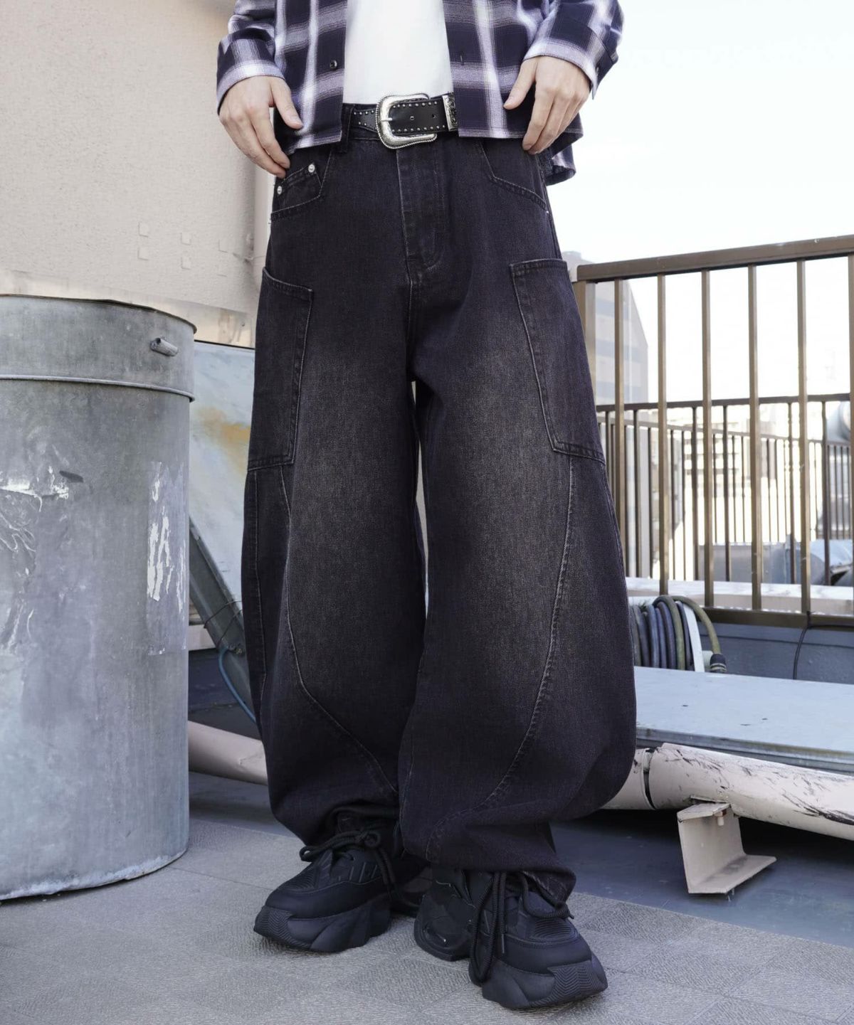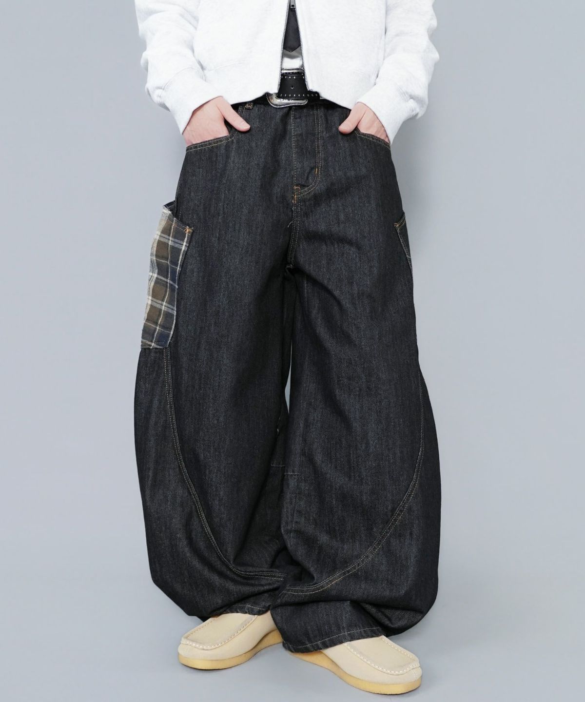 バルーンデニムワイドパンツ/チェック/バギー/カーブ