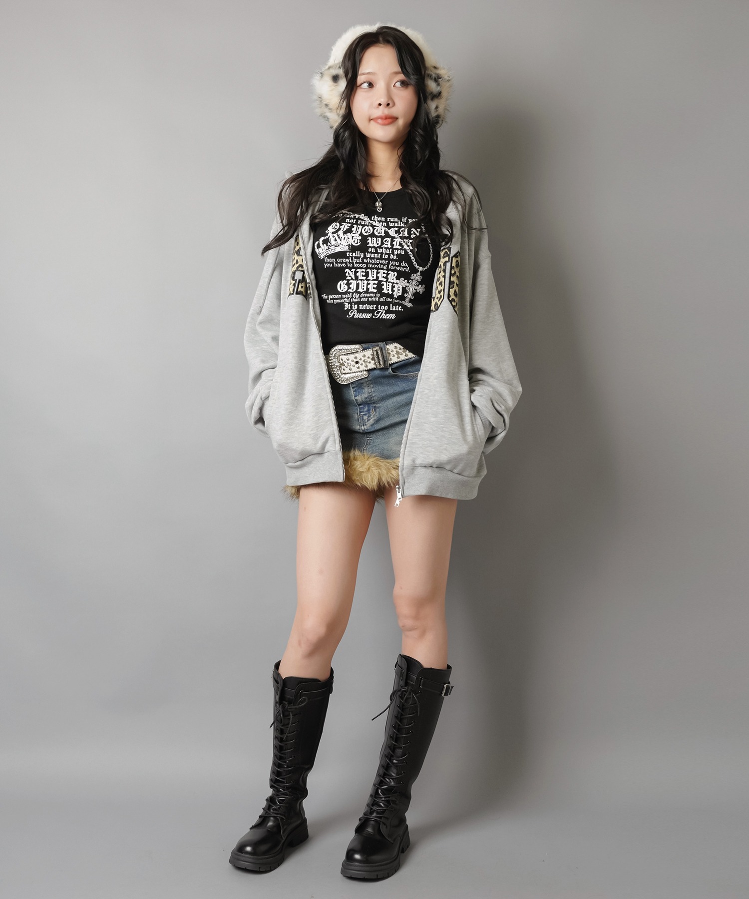 存在感たっぷりのヒョウ柄ロゴが目を引くジップパーカーを主役にした、平成ギャル感全開のストリートコーデ!
