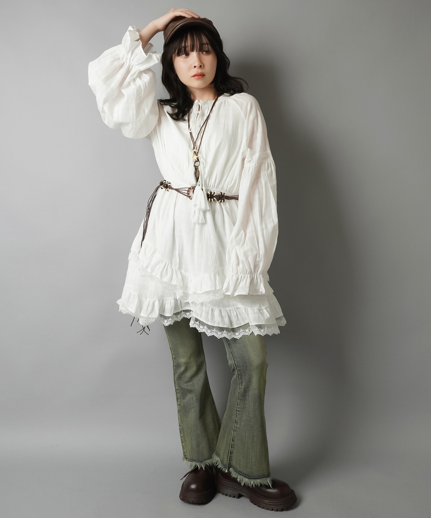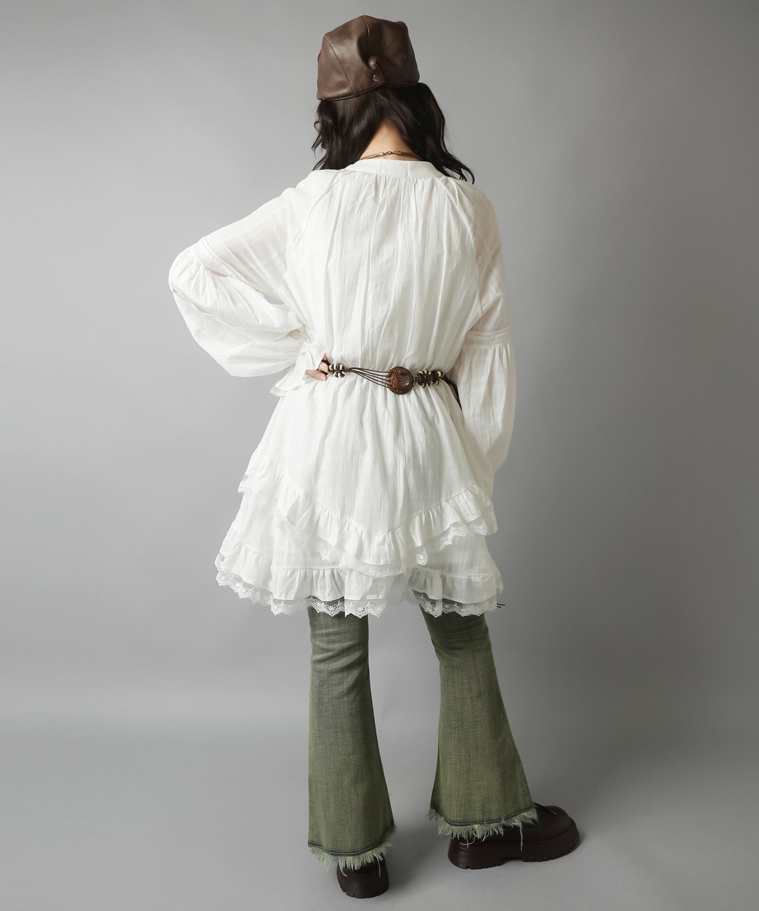 柔らかな素材に、裾のレース切り替えが軽やかな動きをプラスし、ナチュラルながらもしっかり存在感のある一枚です。