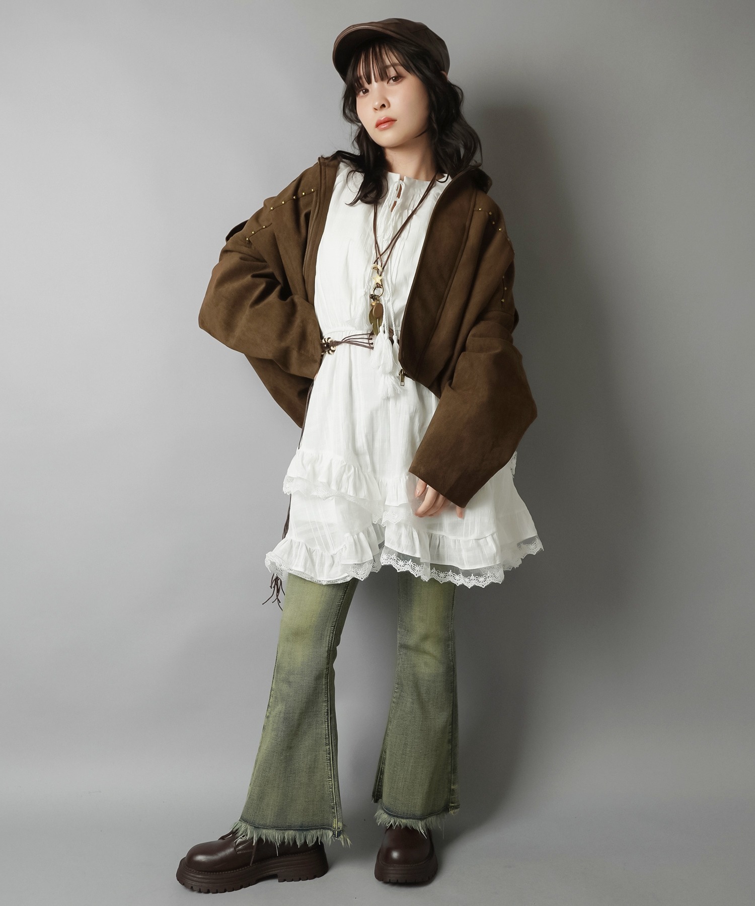 アウターにはスタッズ付きのブラウンジャケットを合わせて、ウエスタンムードをプラス!